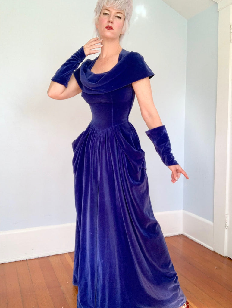 Pure 1940s glamour in luscious draped deep jewel toned periwinkle cotton velvet… This color truly is a site to behold in person. Side metal zipper with hook and eye closure. The cotton velvet is extremely soft and has a lovely heavier weight- it hangs / drapes beautifully. Dramatic draped fold over neckline that continues to the sleeves, princess seamed fitted bodice, nipped defined basque wasp waist, and extremely full sweeping floor length skirt with front center draping and huge 3D hip pockets. Matching gauntlet gloves that go into points over your hands. This is very glamorous old Hollywood, very silver screen bombshell.