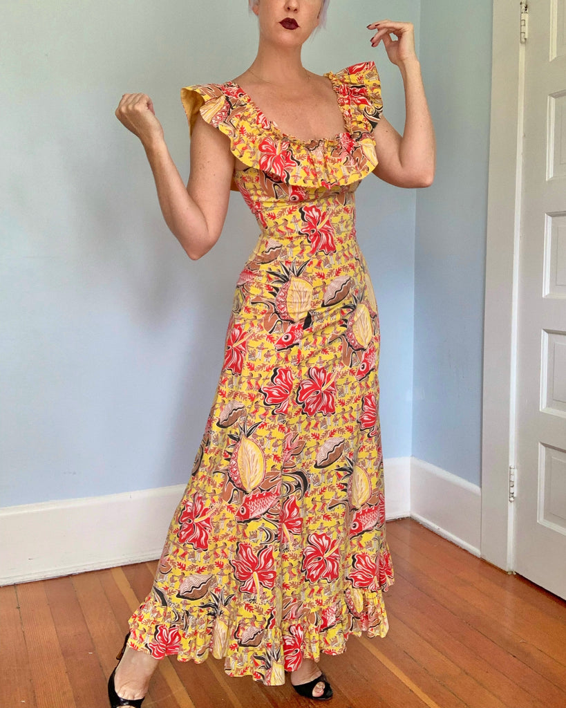 Aloooooha! Out of my most recent batch of Hawaiians, this one is definitely one of my top favorites! This print is just too too good! Original 1940s cotton Hawaiian hourglass maxi dress by one of the most prominent labels in 1940s Hawaiiana, “Surfriders Sportswear Manufacturers!” Made in Honolulu. This is a tinier piece, it is tagged a vintage size 10, best for a modern small. Elastic lined ruffled neckline that can be worn on or off the shoulders, trimmed underneath and golden yellow cotton. Princess seamed for a fitted tailored bodice and nipped wasp waist, full flowing long maxi skirt with ruffled hem. Side metal zipper. This print is so fabulous, a golden yellow background with accent shades of rich lipstick red, inky black, white, and caramel. The novelty print is of hula dancers dancing to a Hawaiian band playing conga drums and ukuleles, huge hibiscus flowers, clamshells, pineapples, and of course huge fish! Such a conversation piece! If this one fit me properly I would not be selling it, it is very rare.