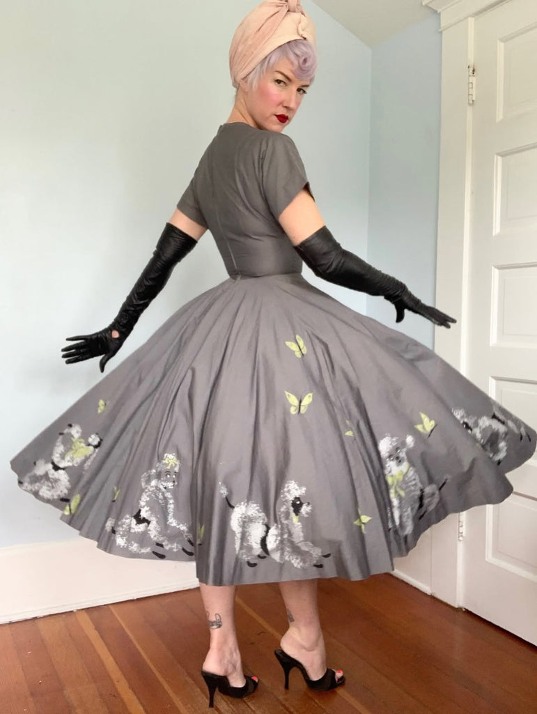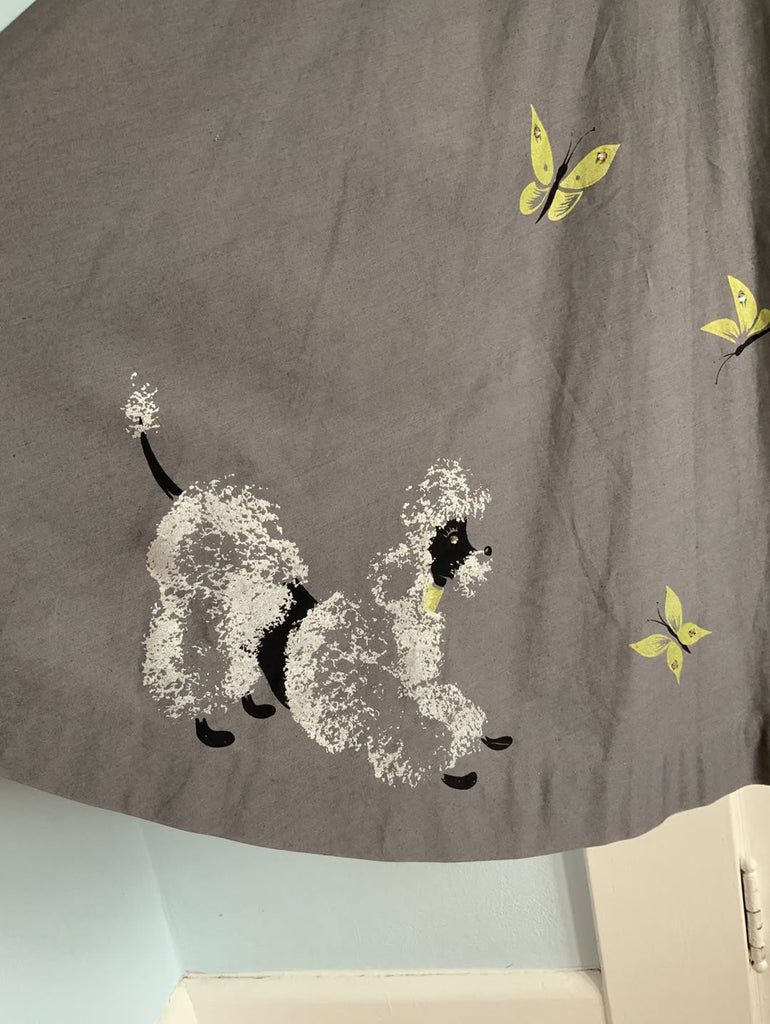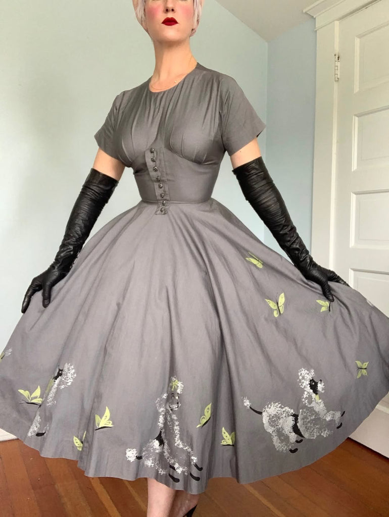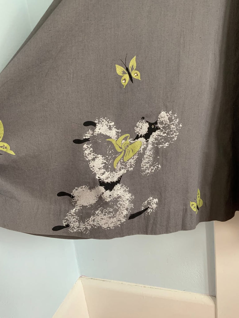 Something utterly FABOO for the French poodle aficionados… Original 1950s cool grey polished cotton day dress with the hugest beyond circle skirt with a darling French poodle novelty border print! The poodles are chasing butterflies! The poodles are white and grey with black accents, the butterflies are yellow. The entire print is hand embellished in sparkling rhinestones. Back metal zipper.