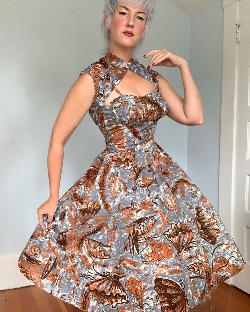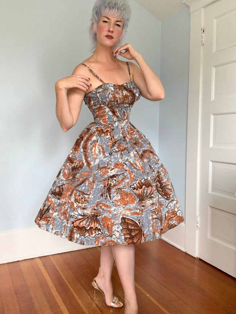 The dress has thin spaghetti straps, a beautifully pleated shelf bust design, fitted princess seamed midsection, nipped defined wasp waist, and full complete circle skirt with hidden hip pockets. The cotton fabric is a spectacular under the sea hand painted novelty print of fish, seashells, clams, seaweed, coral, etc. So fabulous! A really killer piece of vintage Hawaiiana for the discerning collector.