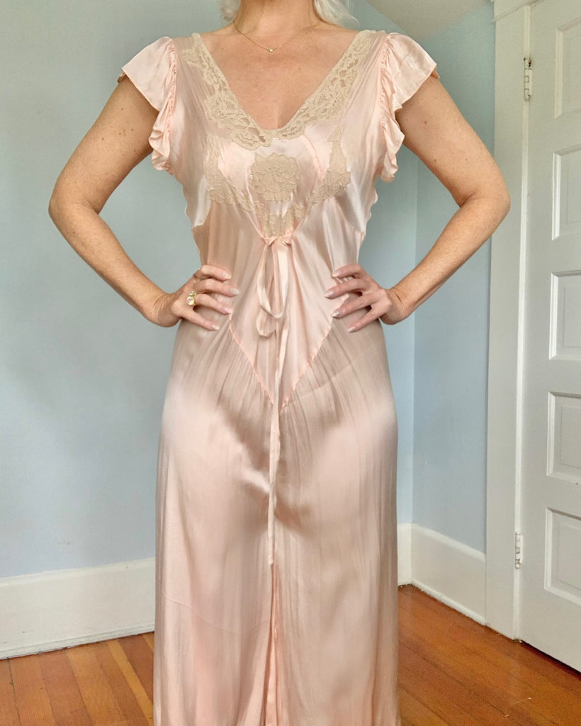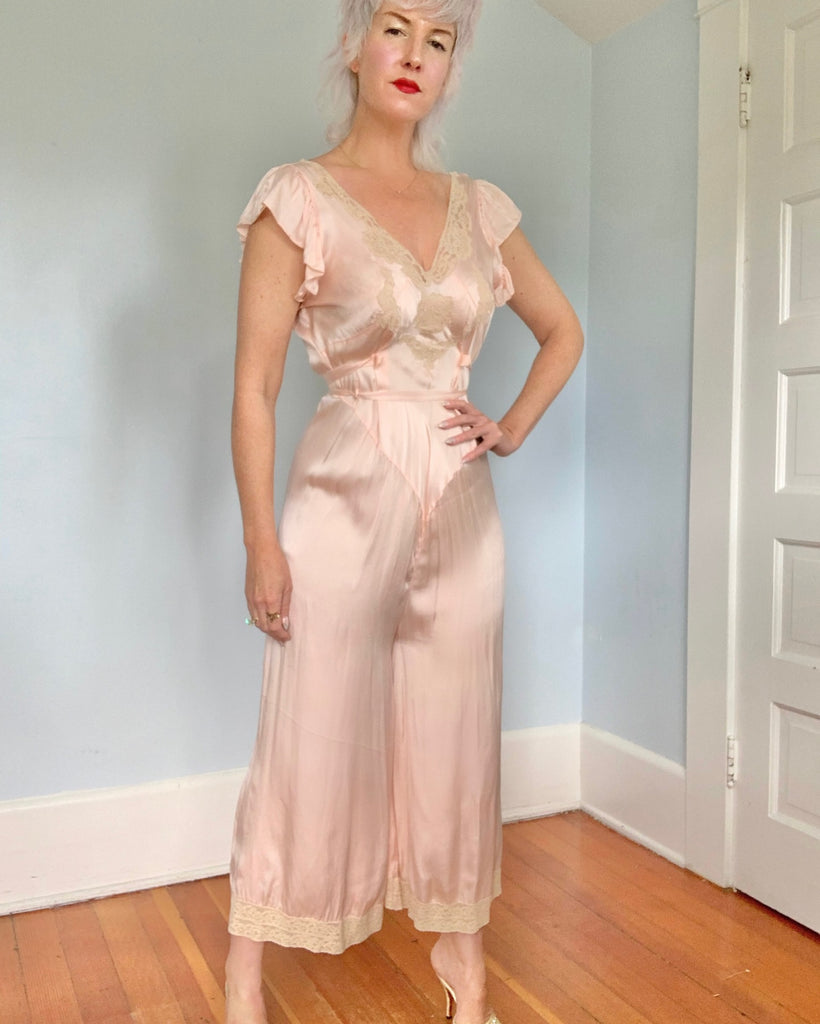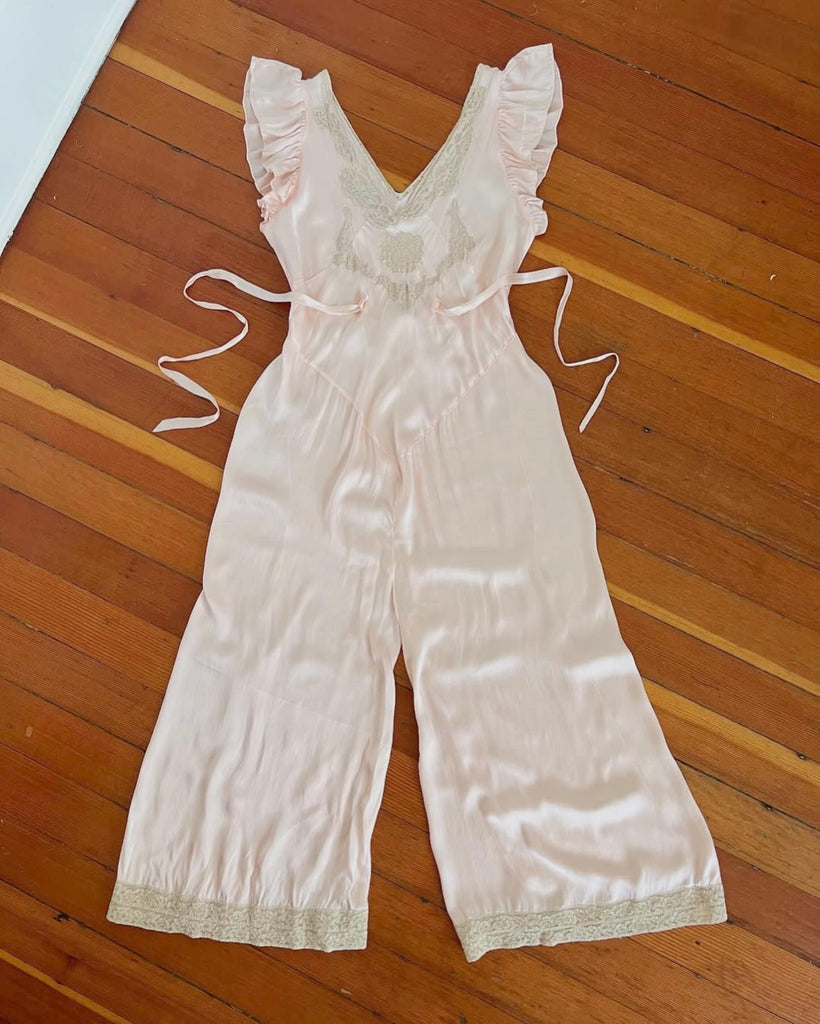 These are so lush… The ultimate in vintage luxury and boudoir glamour… Now here’s a first! I’ve never seen one like this, so sensual and luxurious! Original 1930s beach pajama step-in jumpsuit in sensuous ballet slipper pink pure silk with hand made lace trim!